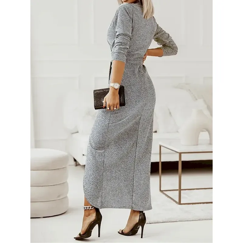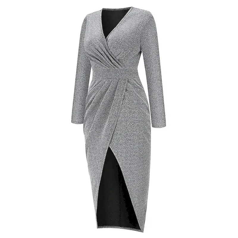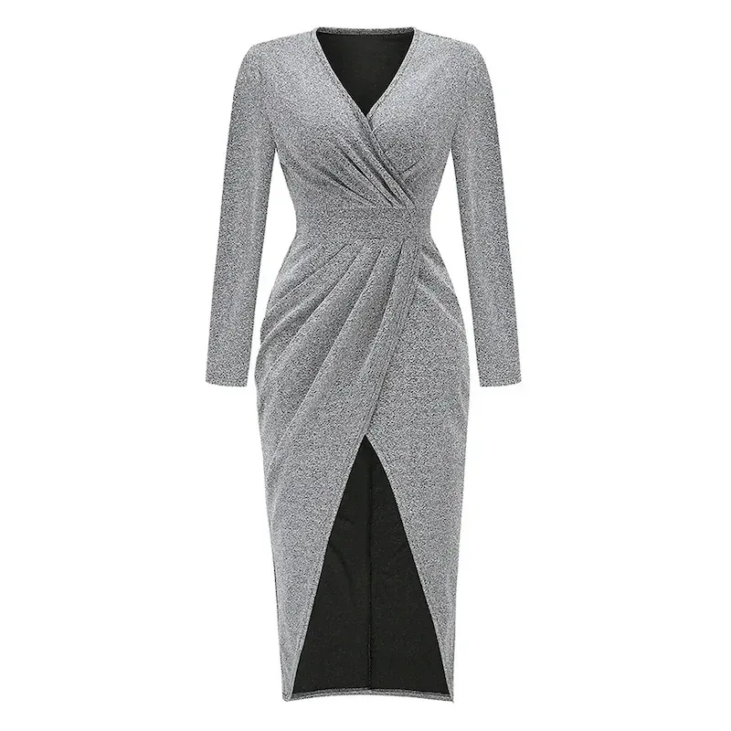 [Design Highlights:] This dress features a chic V-neckline and long sleeves, while the front slit adds a hint of drama to the floor-length hem. The dress is enhanced by ruched detailing and subtle sparkle, offering a sophisticated touch and modern flair.