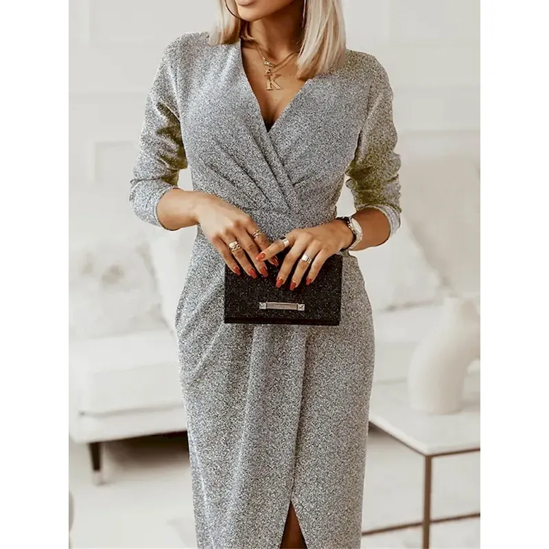 Women’s Black Dress Party Dress Wedding Guest Dress Ruched Split V Neck Long Sleeve Formal Winter Dress Silver Black Spring Fall